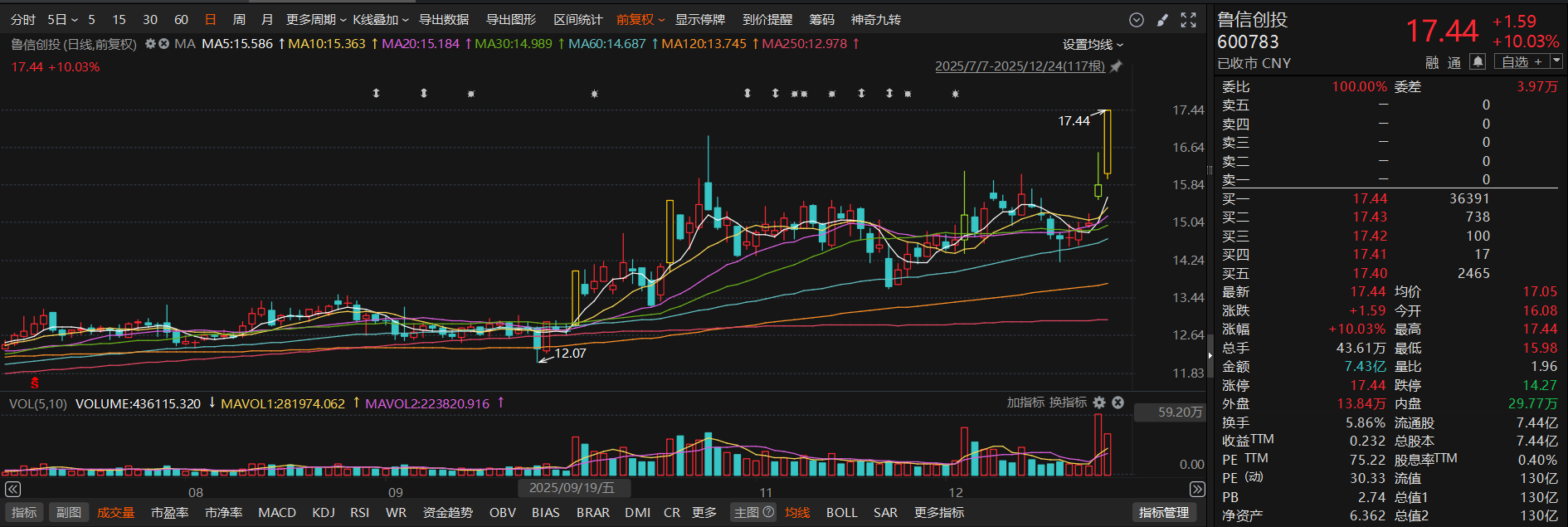 小財注:截至三季度末,魯信集團(tuán)位列魯信創(chuàng)投第一大股東,持股5.14億股,占公司總股本的69%。二級市場上,魯信創(chuàng)投自9月23日低點(diǎn)迄今股價累計最大漲幅為44%,今日收盤漲停。