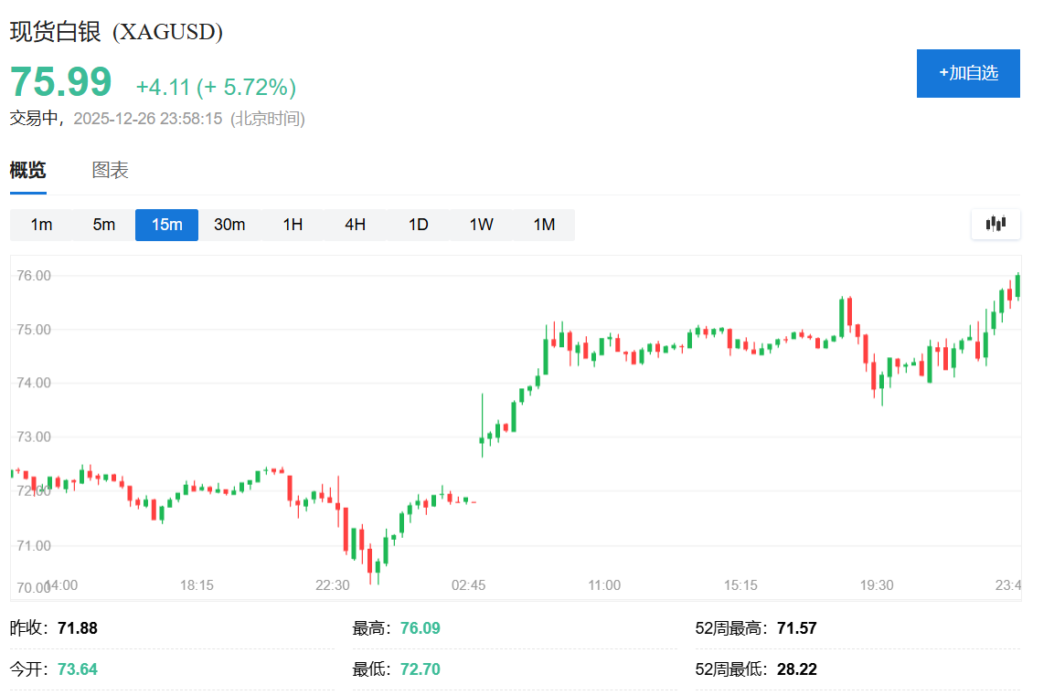 財(cái)聯(lián)社12月26日電,現(xiàn)貨白銀站上76美元/盎司,日內(nèi)漲近6%,年內(nèi)漲幅擴(kuò)大至逾160%。