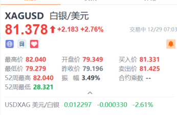 財(cái)聯(lián)社12月29日電,現(xiàn)貨白銀開盤快速拉升,一度突破82美元/盎司。