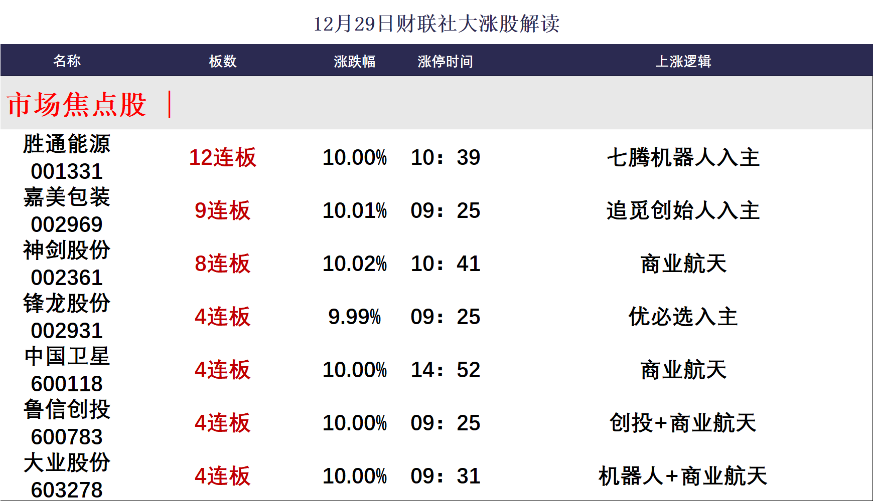 財聯(lián)社12月29日電,今日全市場共72股漲停,連板股總數(shù)18只,26股封板未遂,封板率為73%(不含ST股、退市股)。焦點股方面,實控人變更的勝通能源12連板、嘉美包裝9連板、鋒龍股份4連板,商業(yè)航天概念股神劍股份8連板、中國衛(wèi)星4連板、魯信創(chuàng)投4連板、大業(yè)股份4連板。