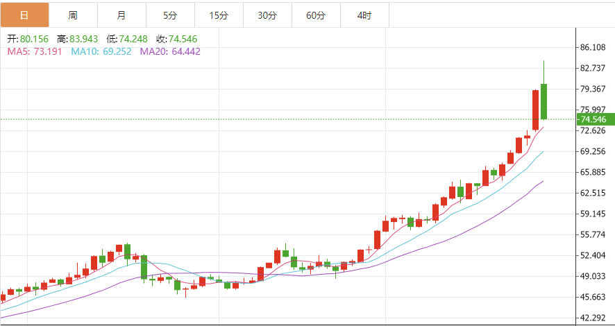 財(cái)聯(lián)社12月29日電,現(xiàn)貨白銀日內(nèi)跌幅擴(kuò)大至6%,報(bào)74.38美元/盎司,盤中一度大漲6%創(chuàng)記錄新高。現(xiàn)貨白銀從盤中最高價(jià)格的84.0美元算起,短短9個(gè)多小時(shí),已下跌9.6美元,即11.4%。