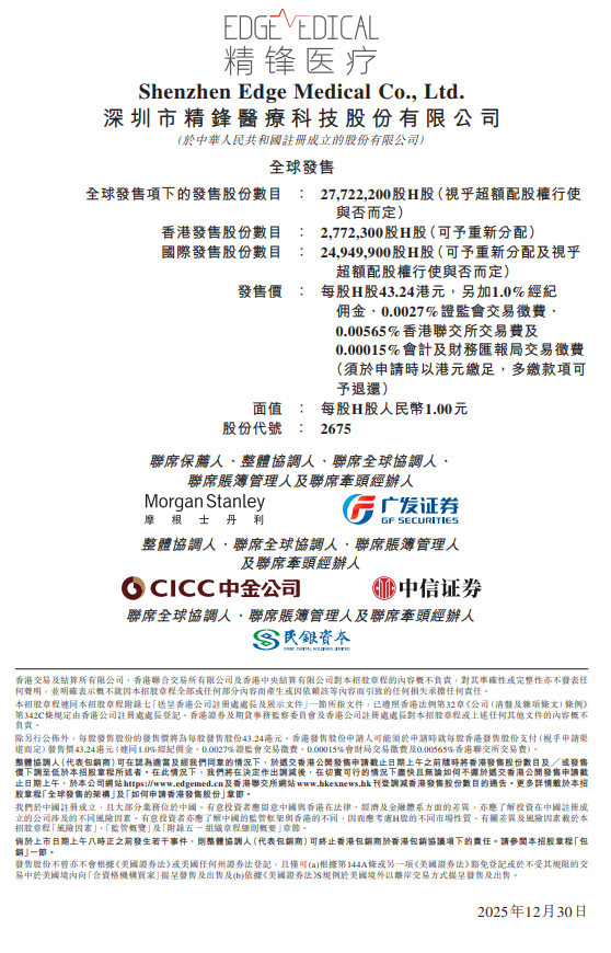 財聯(lián)社12月30日電,深圳市精鋒醫(yī)療科技股份有限公司(Edge Medical)在港交所公告,在港上市擬發(fā)行2270萬股股票,發(fā)行價每股43.24港元。預計股票將從1月8日開始交易。