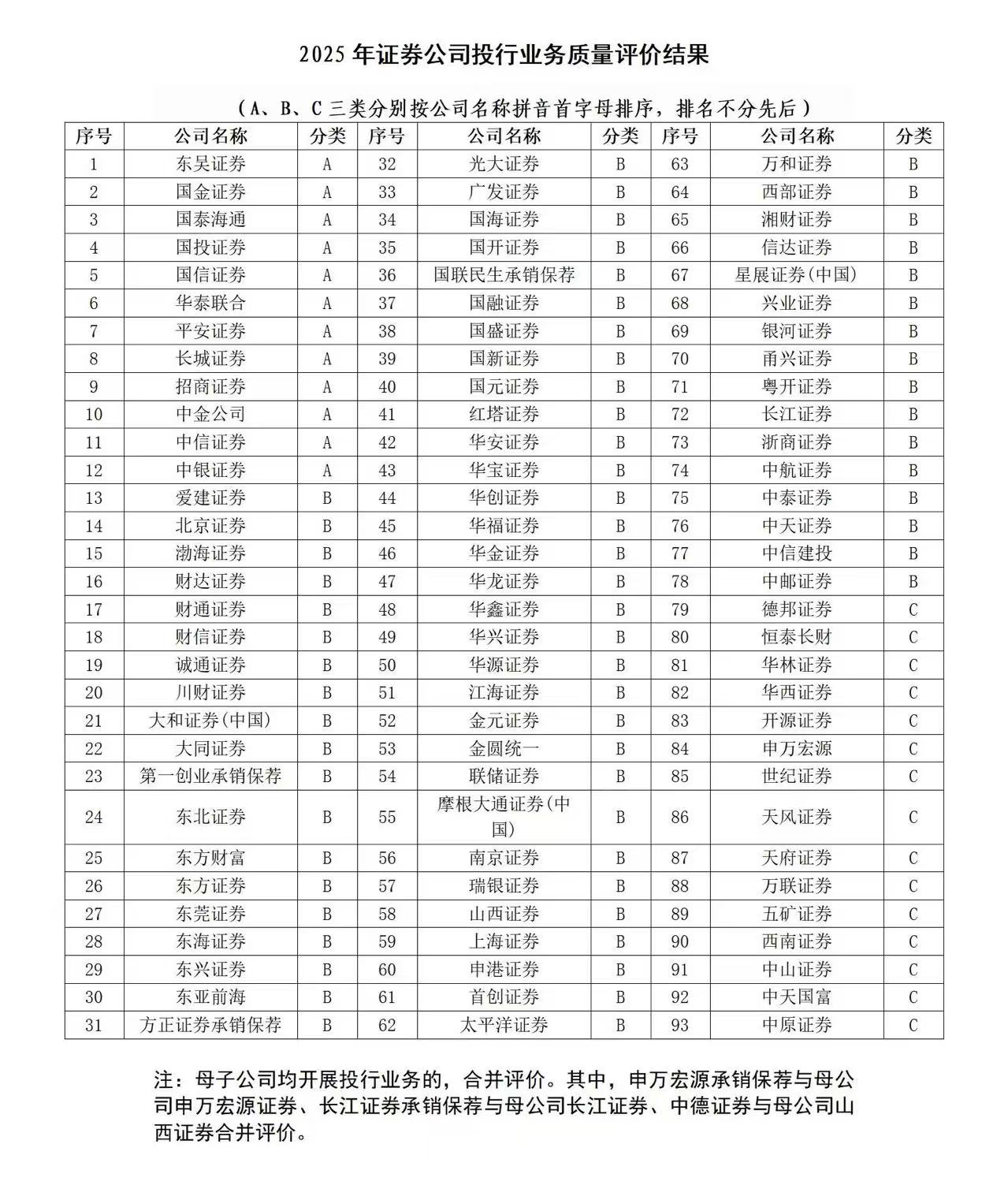 財(cái)聯(lián)社12月30日電,2025年券商投行業(yè)務(wù)質(zhì)量結(jié)果出爐。根據(jù)中證協(xié)最新披露,今年評(píng)價(jià)結(jié)果A類12家、B類66家、15家C類。其中,A類公司為東吳、國(guó)金、國(guó)泰海通、國(guó)投、國(guó)信、華泰聯(lián)合、平安、長(zhǎng)城、招商、中金、中信、中銀證券等12家券商;C類為德邦、恒泰長(zhǎng)財(cái)、華林、華西、開(kāi)源、申萬(wàn)宏源、世紀(jì)、天風(fēng)、天府、萬(wàn)聯(lián)、五礦、西南、中山、中天國(guó)富、中原證券等15家券商。券商投行業(yè)務(wù)質(zhì)量評(píng)價(jià)結(jié)果備受行業(yè)關(guān)注,這與券商分類評(píng)價(jià)等機(jī)制掛鉤。(財(cái)聯(lián)社記者 林堅(jiān))