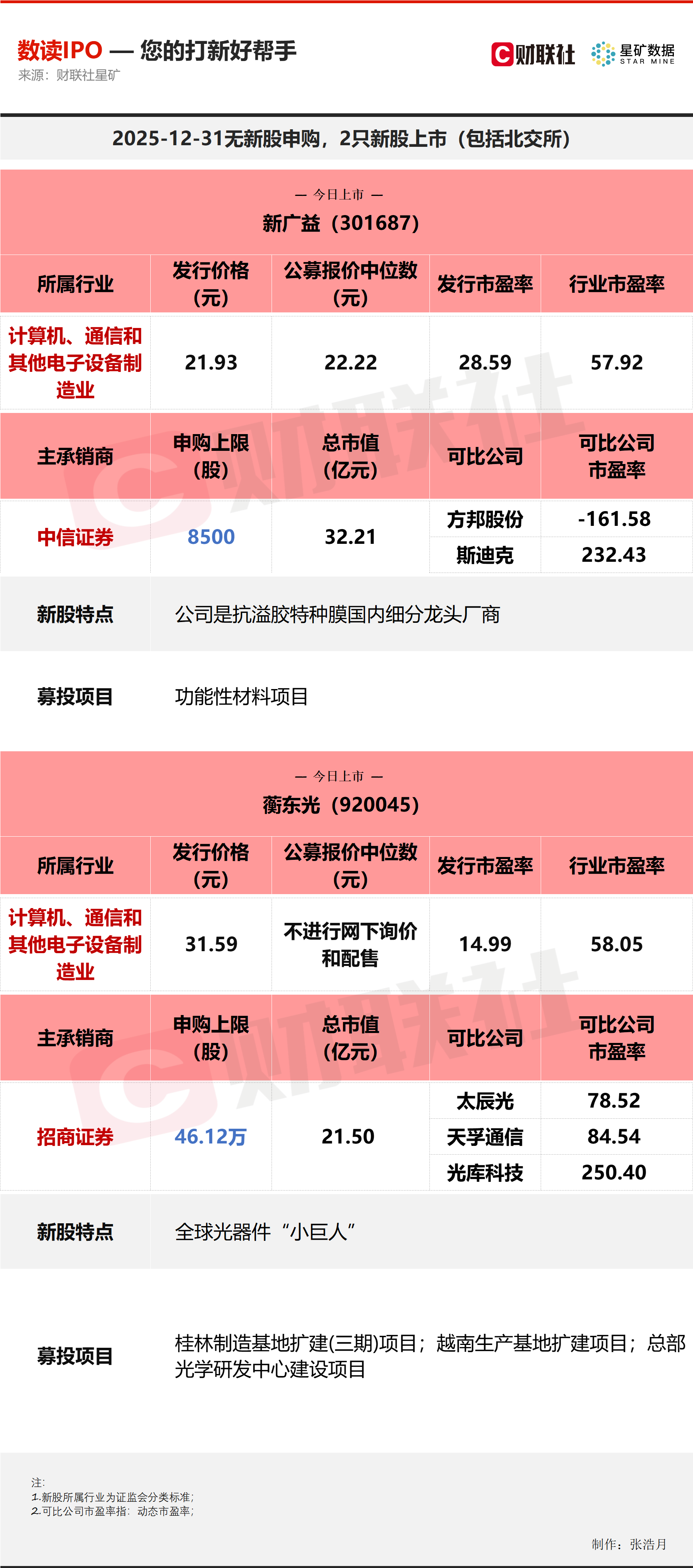 財(cái)聯(lián)社12月31日電,今日無(wú)新股申購(gòu);有2只新股上市,分別為創(chuàng)業(yè)板的新廣益,北交所的蘅東光。