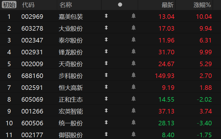 財(cái)聯(lián)社12月31日電,市場(chǎng)焦點(diǎn)股嘉美包裝(10板)競(jìng)價(jià)漲停,商業(yè)航天概念股大業(yè)股份(5板)高開9.94%、泰爾股份(4板)高開6.31%,機(jī)器人概念股鋒龍股份(5板)競(jìng)價(jià)漲停、天奇股份(4板)高開5.29%、步科股份(科創(chuàng)板2板)高開2.70%,鈉電池概念股恒大高新(3板)高開1.88%,AI智能體概念股正和生態(tài)(5天3板)低開2.02%,液冷服務(wù)器概念股宏英智能(2板)高開3.74%、統(tǒng)一股份(2板)低開3.40%,數(shù)字貨幣概念股御銀股份(2板)低開1.75%。