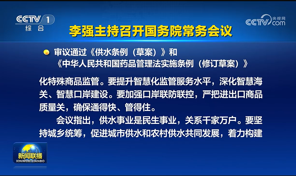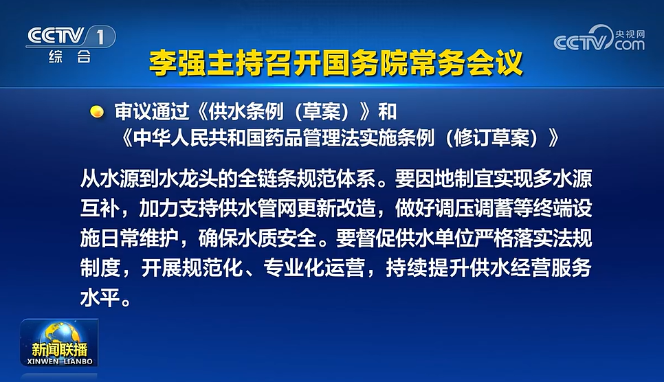 財聯(lián)社12月31日電,據(jù)央視新聞,李強主持召開國務(wù)院常務(wù)會議,審議通過《供水條例(草案)》和《中華人民共和國藥品管理法實施條例(修訂草案)》。會議指出,供水事業(yè)是民生事業(yè),關(guān)系千家萬戶。要堅持城鄉(xiāng)統(tǒng)籌,促進城市供水和農(nóng)村供水共同發(fā)展,著力構(gòu)建從水源到水龍頭的全鏈條規(guī)范體系。要因地制宜實現(xiàn)多水源互補,加力支持供水管網(wǎng)更新改造,做好調(diào)壓調(diào)蓄等終端設(shè)施日常維護,確保水質(zhì)安全。要督促供水單位嚴(yán)格落實法規(guī)制度,開展規(guī)范化、專業(yè)化運營,持續(xù)提升供水經(jīng)營服務(wù)水平。會議指出,根據(jù)形勢變化及時修訂藥品管理監(jiān)督法律法規(guī),對于保障人民群眾用藥安全、促進醫(yī)藥產(chǎn)業(yè)健康有序發(fā)展具有重要意義。要完善藥品研制和注冊制度,加快突破性治療藥物審評審批,不斷激發(fā)產(chǎn)業(yè)創(chuàng)新發(fā)展活力。要加強全鏈條全流程質(zhì)量監(jiān)管,嚴(yán)厲打擊藥品領(lǐng)域違法違規(guī)行為。