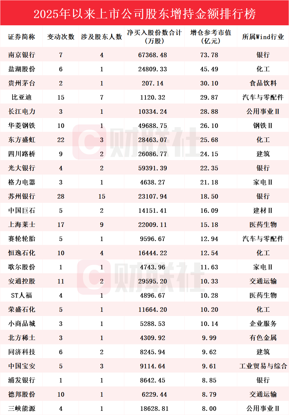 財(cái)聯(lián)社12月31日電,Wind數(shù)據(jù)顯示,截至發(fā)稿,2025年以來,已有523家A股上市公司股東實(shí)施增持,累計(jì)增持金額為939.6億元。從上市公司股東增持的金額來看,有20家公司股東增持金額超過10億元,具體為南京銀行、鹽湖股份、貴州茅臺(tái)、比亞迪、長江電力、華菱鋼鐵、東方盛虹、四川路橋、光大銀行、格力電器、蘇州銀行、中國巨石、上海萊士、賽輪輪胎、恒逸石化、歌爾股份、安通控股、ST人福、榮盛石化和小商品城。其中,南京銀行股東增持額位居榜首,金額為73.78億元;鹽湖股份、貴州茅臺(tái)股東增持額分別為45.49億元、30.1億元,位列第二和第三。