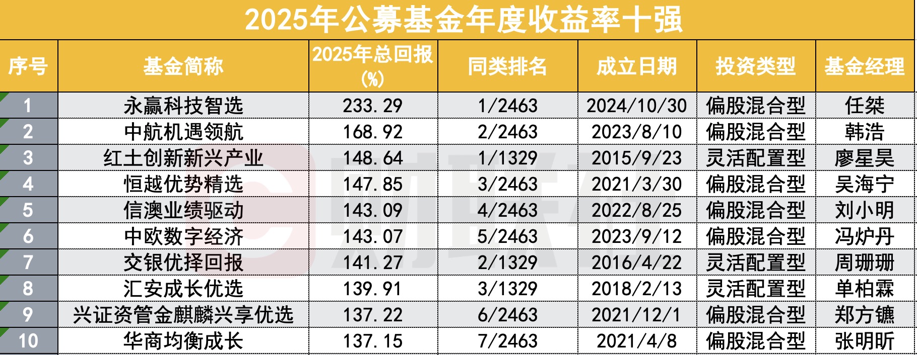 財聯(lián)社12月31日電,隨著2025年最后一個交易日凈值披露完成,公募基金年度收益率十強出爐。永贏科技智選以233.29%摘下桂冠,創(chuàng)造公募基金年度回報新紀(jì)錄;亞軍為中航機遇領(lǐng)航,回報率收益率為168.92%。從第三名至第十名,基金之間競爭異常激烈,直至最后一個交易日才塵埃落定,紅土創(chuàng)新新興產(chǎn)業(yè)以148.64%回報率獲得年度季軍。恒越優(yōu)勢精選、信澳業(yè)績驅(qū)動、中歐數(shù)字經(jīng)濟、交銀優(yōu)擇回報緊隨其后,年度回報率均超140%。此外,匯安成長優(yōu)選、興證資管金麒麟興享優(yōu)選以及華商均衡成長躋身前十。2025年度收益率十強全部為主動權(quán)益類基金,在A股市場結(jié)構(gòu)性行情中,主動管理能力突出的基金通過行業(yè)配置與個股選擇,顯著跑贏了被動指數(shù)型產(chǎn)品,延續(xù)主動權(quán)益基金在波動市場中的優(yōu)勢。(財聯(lián)社記者 閆軍)