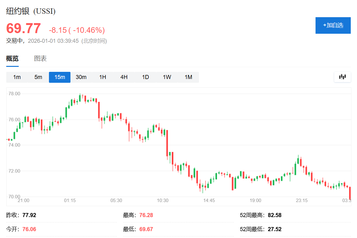財聯(lián)社1月1日電,紐約期銀失守70美元/盎司,日內(nèi)跌幅超10%。