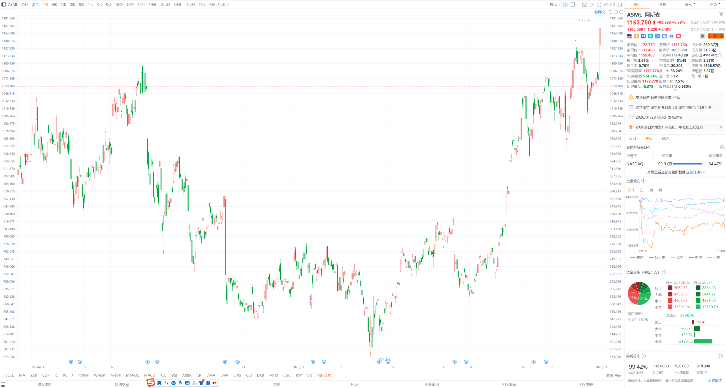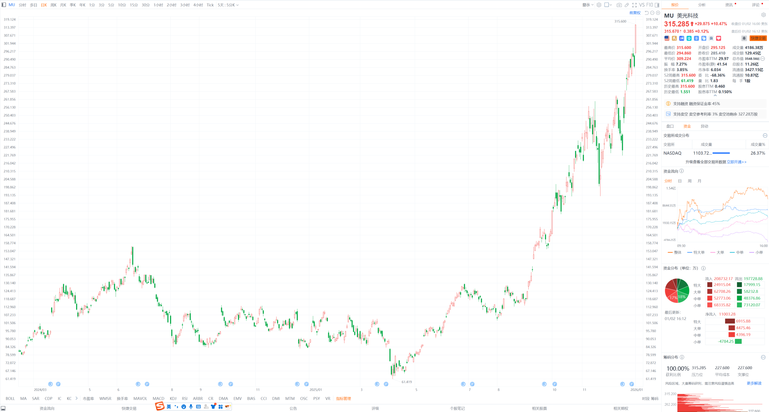 財(cái)聯(lián)社1月3日電,美股三大指數(shù)收盤漲跌不一,納指高開低走,收跌0.03%,標(biāo)普500指數(shù)微漲0.19%,道指漲0.66%。明星科技股表現(xiàn)分化,阿斯麥漲超近9%,美光科技漲超10%,二者股價(jià)均創(chuàng)歷史新高。AMD漲超4%,英偉達(dá)漲超1%,谷歌微漲;特斯拉、微軟跌超2%,亞馬遜跌近2%,Meta跌超1%,蘋果微跌。