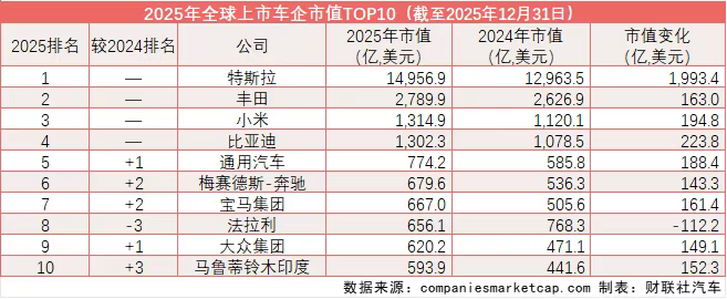財(cái)聯(lián)社1月5日電,汽車產(chǎn)業(yè)深度變革背景下,全球車企市值排名的更新既是中國(guó)、外資車企行業(yè)地位與競(jìng)爭(zhēng)格局的直觀體現(xiàn),亦為市場(chǎng)對(duì)汽車企業(yè)全產(chǎn)業(yè)鏈價(jià)值的綜合判斷。截至2025年12月31日收盤,在全球車企TOP10中,新勢(shì)力車企與傳統(tǒng)車企、海外車企與中國(guó)車企之間的市值排名競(jìng)爭(zhēng)呈現(xiàn)兩種局面——特斯拉、豐田、小米、比亞迪分列前四,排名較一年前無(wú)變化的同時(shí)各自市值有所增長(zhǎng),且全球十大市值車企中依舊有兩家中國(guó)公司;五至十名位次發(fā)生“巨變”——寶馬、奔馳、大眾等排名全面提升,保時(shí)捷掉出前十,馬魯?shù)兮從居《取叭胩妗蔽涣械谑#ㄘ?cái)聯(lián)社記者 張屹鵬)