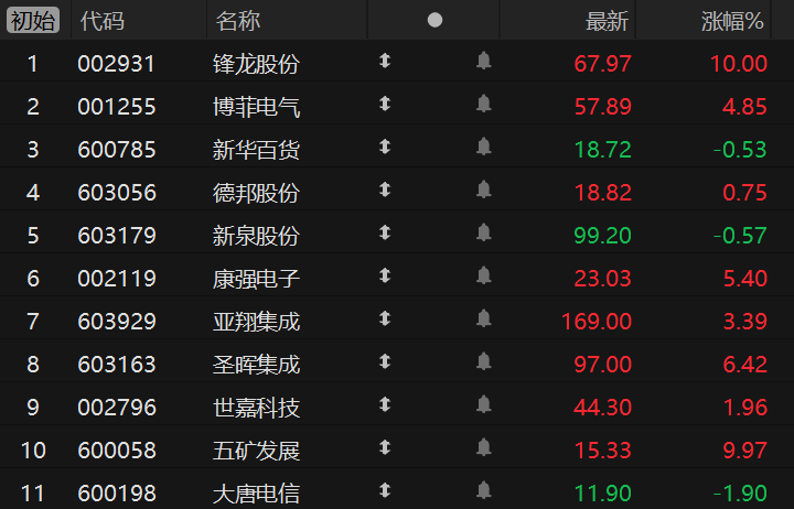 財聯(lián)社1月19日電,市場焦點股鋒龍股份(13板)競價漲停,智能電網(wǎng)板塊博菲電氣(9天6板)高開4.85%,股權轉讓的新華百貨(3板)低開0.53%,溢價主動退市的德邦股份(3板)高開0.75%,機器人概念股新泉股份(6天3板)低開0.57%,芯片產(chǎn)業(yè)鏈的康強電子(2板)高開5.40%、亞翔集成(3天2板)高開3.39%、圣暉集成(3天2板)高開6.42%,光通信板塊世嘉科技(2板)高開1.96%,資產(chǎn)重組的五礦發(fā)展(2板)競價漲停,商業(yè)航天概念股大唐電信(3天2板)低開1.90%。
