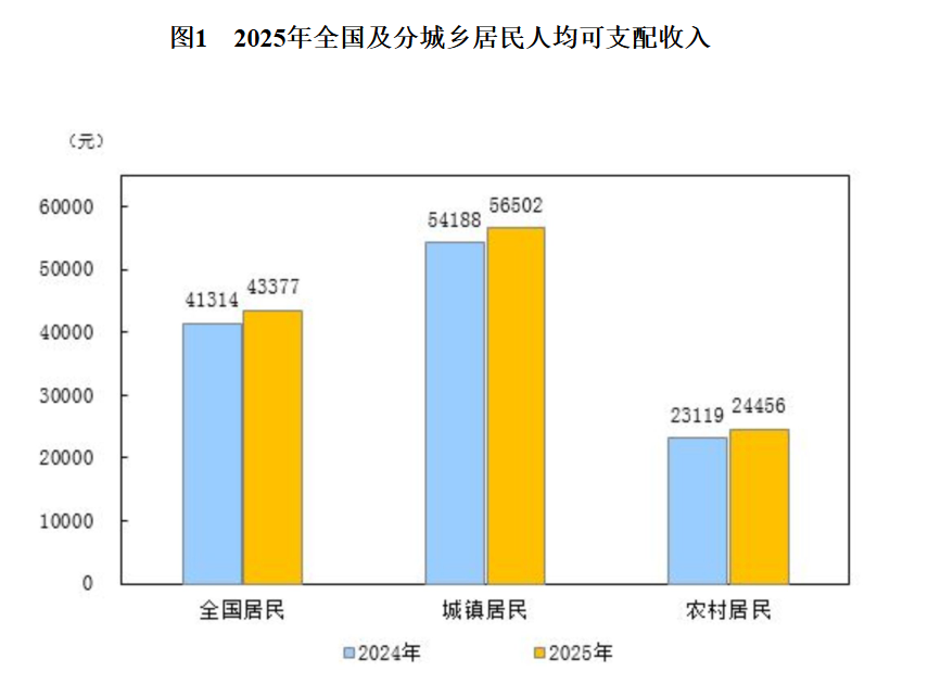 財(cái)聯(lián)社1月19日電,國(guó)家統(tǒng)計(jì)局19日發(fā)布數(shù)據(jù)顯示,2025年,全國(guó)居民人均可支配收入43377元,比上年名義增長(zhǎng)5.0%,扣除價(jià)格因素,實(shí)際增長(zhǎng)5.0%。分城鄉(xiāng)看,城鎮(zhèn)居民人均可支配收入56502元,增長(zhǎng)(以下如無(wú)特別說(shuō)明,均為同比名義增長(zhǎng))4.3%,扣除價(jià)格因素,實(shí)際增長(zhǎng)4.2%;農(nóng)村居民人均可支配收入24456元,增長(zhǎng)5.8%,扣除價(jià)格因素,實(shí)際增長(zhǎng)6.0%。