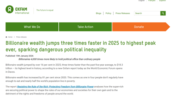 財聯(lián)社1月19日電,據(jù)全球慈善組織樂施會(Oxfam)周一發(fā)布的報告,2025年全球億萬富翁的財富大幅增長,達到創(chuàng)紀錄的18.3萬億美元。該報告稱,去年全球億萬富翁的人數(shù)已經(jīng)突破3000人,其財富總額增長了16%,即2.5萬億美元。這一增速是過去五年平均水平的三倍。與此同時,在富人愈發(fā)富有的背景下,全球減貧進程卻有所放緩。樂施會的報告顯示,當前全球貧困率“大致與 2019 年時的水平相當”,近一半的世界人口生活在貧困之中。
