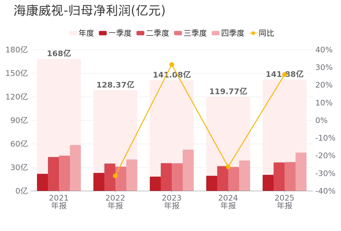 財(cái)聯(lián)社1月20日電,??低?002415.SZ)發(fā)布2025年度業(yè)績(jī)快報(bào),實(shí)現(xiàn)營(yíng)業(yè)總收入925.18億元,同比增長(zhǎng)0.02%。營(yíng)業(yè)利潤(rùn)、利潤(rùn)總額和歸屬于上市公司股東的凈利潤(rùn)分別為169.78億元、170.29億元和141.88億元,同比分別增長(zhǎng)18.63%、18.72%和18.46%。公司總資產(chǎn)和歸屬于上市公司股東的所有者權(quán)益分別達(dá)到1381.50億元和833.38億元,同比分別增長(zhǎng)4.65%和3.31%。2025年度,公司主動(dòng)推進(jìn)全面經(jīng)營(yíng)策略調(diào)整,堅(jiān)定執(zhí)行以利潤(rùn)為中心的經(jīng)營(yíng)導(dǎo)向,持續(xù)推動(dòng)組織變革和精細(xì)化管理,加快數(shù)字化轉(zhuǎn)型,努力實(shí)現(xiàn)高質(zhì)量、可持續(xù)的增長(zhǎng)。小財(cái)注:??低?025年Q3凈利36.62億元,據(jù)此計(jì)算,2025年Q4凈利48.69億元,環(huán)比增長(zhǎng)32.96%。第四季度凈利潤(rùn)分析師一致預(yù)測(cè)為43.37億。