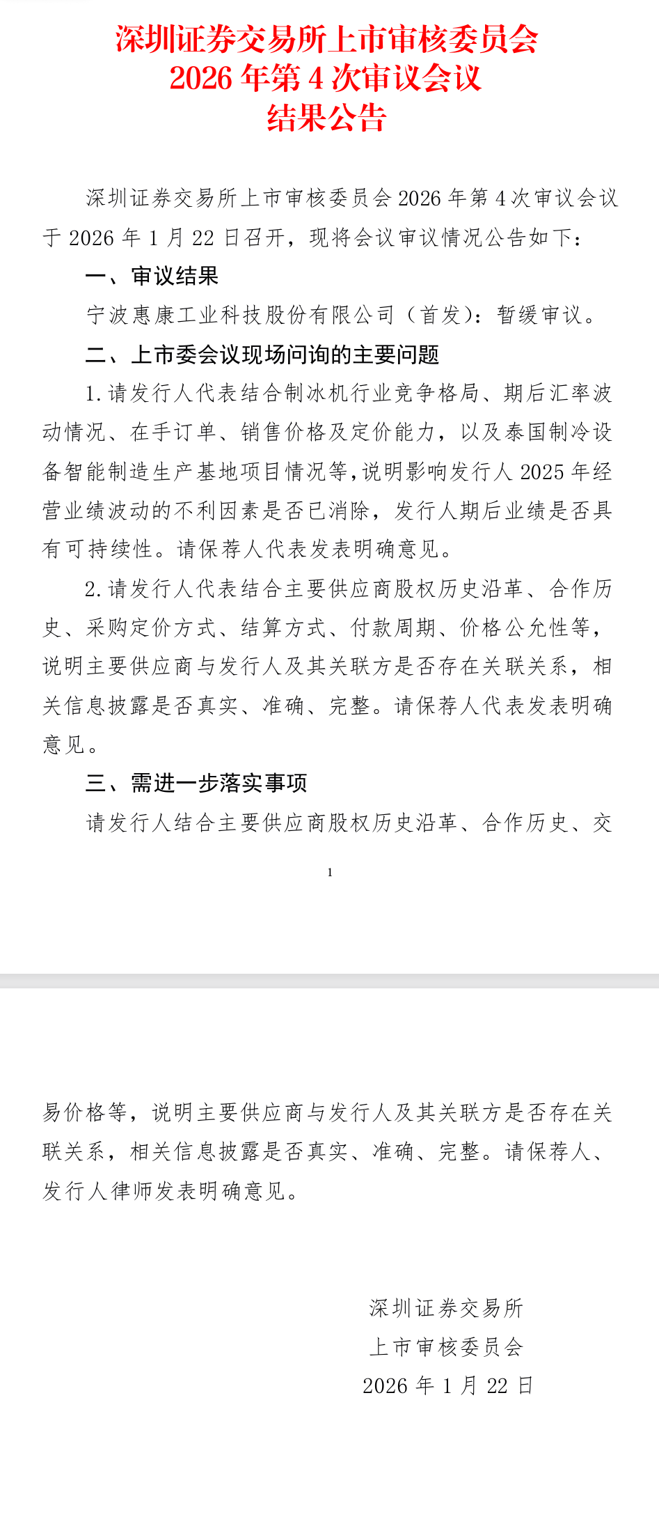 財聯(lián)社1月22日電,深圳證券交易所上市審核委員會2026年第4次審議會議于2026年1月22日召開,審議結果:寧波惠康工業(yè)科技股份有限公司(首發(fā))暫緩審議。需進一步落實事項:請發(fā)行人結合主要供應商股權歷史沿革、合作歷史、交易價格等,說明主要供應商與發(fā)行人及其關聯(lián)方是否存在關聯(lián)關系,相關信息披露是否真實、準確、完整。請保薦人、發(fā)行人律師發(fā)表明確意見。