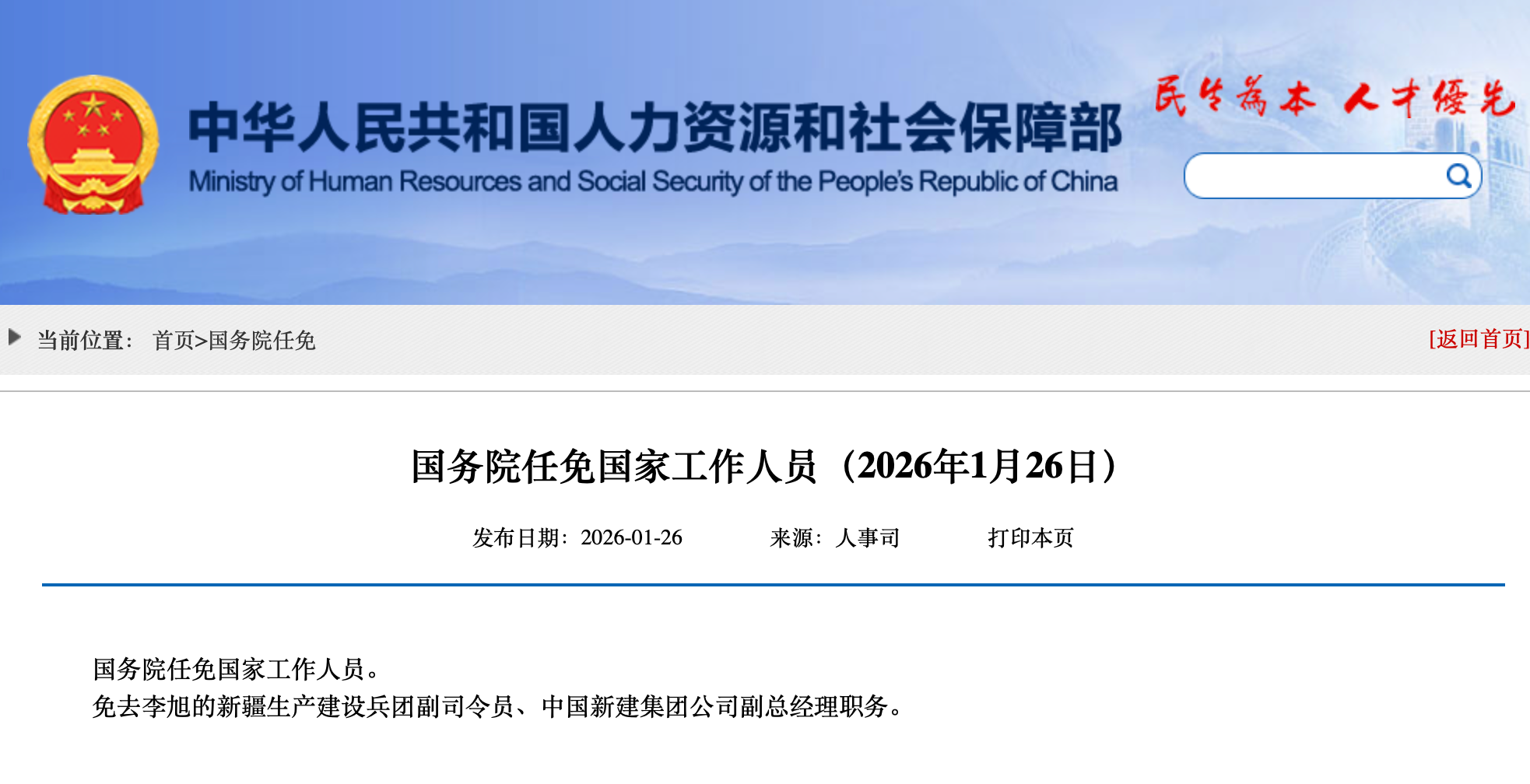 財聯(lián)社1月26日電,國務(wù)院任免國家工作人員。免去李旭的新疆生產(chǎn)建設(shè)兵團(tuán)副司令員、中國新建集團(tuán)公司副總經(jīng)理職務(wù)。