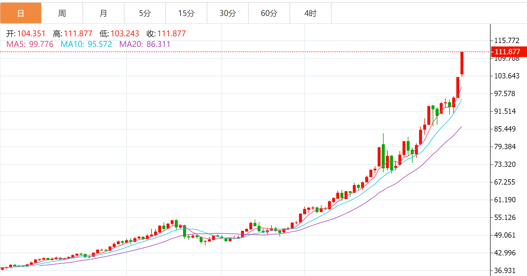 財(cái)聯(lián)社1月26日電,白銀市場加速上漲?,F(xiàn)貨白銀日內(nèi)漲幅擴(kuò)大至8%,報(bào)111.56美元/盎司,本月累計(jì)漲56%。COMEX白銀期貨漲10%,報(bào)111.6美元/盎司,本月累計(jì)漲57%。滬銀期貨主力合約漲7.21%,報(bào)28288元/千克,本月累計(jì)漲66%。
