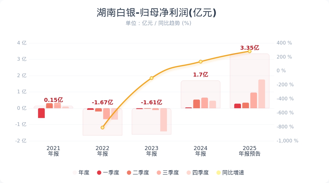 財(cái)聯(lián)社1月28日電,湖南白銀(002716.SZ)公告稱,湖南白銀預(yù)計(jì)2025年歸屬于上市公司股東的凈利潤為2.85億元至3.85億元,比上年同期增長67.88%-126.78%。業(yè)績?cè)鲩L主要系公司聚焦主業(yè)、推進(jìn)精細(xì)化管理與技改升級(jí),生產(chǎn)技術(shù)及經(jīng)濟(jì)指標(biāo)提升;同時(shí)白銀、黃金產(chǎn)量大幅增加,疊加市場價(jià)格整體上行,銷售價(jià)格同步提升。小財(cái)注:湖南白銀2025年Q3凈利0.96億元,據(jù)此計(jì)算,2025年Q4凈利預(yù)計(jì)1.26億元-2.26億元,環(huán)比增長31%-134%。