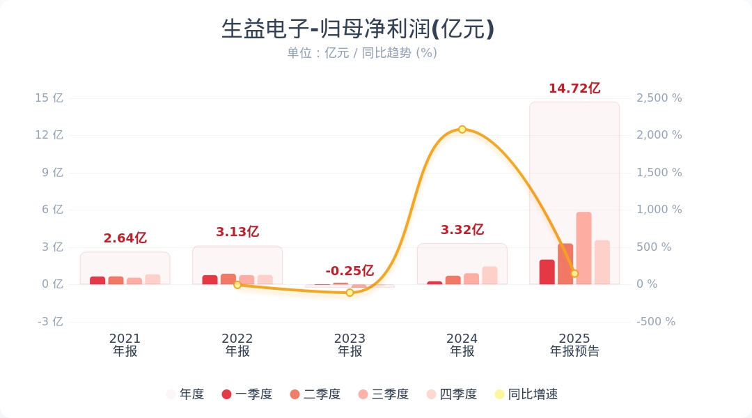《科創(chuàng)板日報》29日訊,生益電子(688183.SH)公告稱,預計2025年歸屬于上市公司股東的凈利潤為14.31億元至15.13億元,同比增加331.03%至355.88%。公司聚焦高端領域市場拓展,加大研發(fā)投入,推進提產擴產進程,同時強化質量管理,以質量筑牢根基,報告期內高附加值產品占比提升,使公司在中高端市場的競爭優(yōu)勢得到進一步鞏固,實現(xiàn)凈利潤較上年同期大幅增長。小財注:Q3凈利潤5.84億元,據(jù)此計算,Q4凈利潤預計3.16億元-3.99億元,環(huán)比下降32%-46%。第四季度凈利潤分析師一致預測為4.33億元,業(yè)績低于預期。
