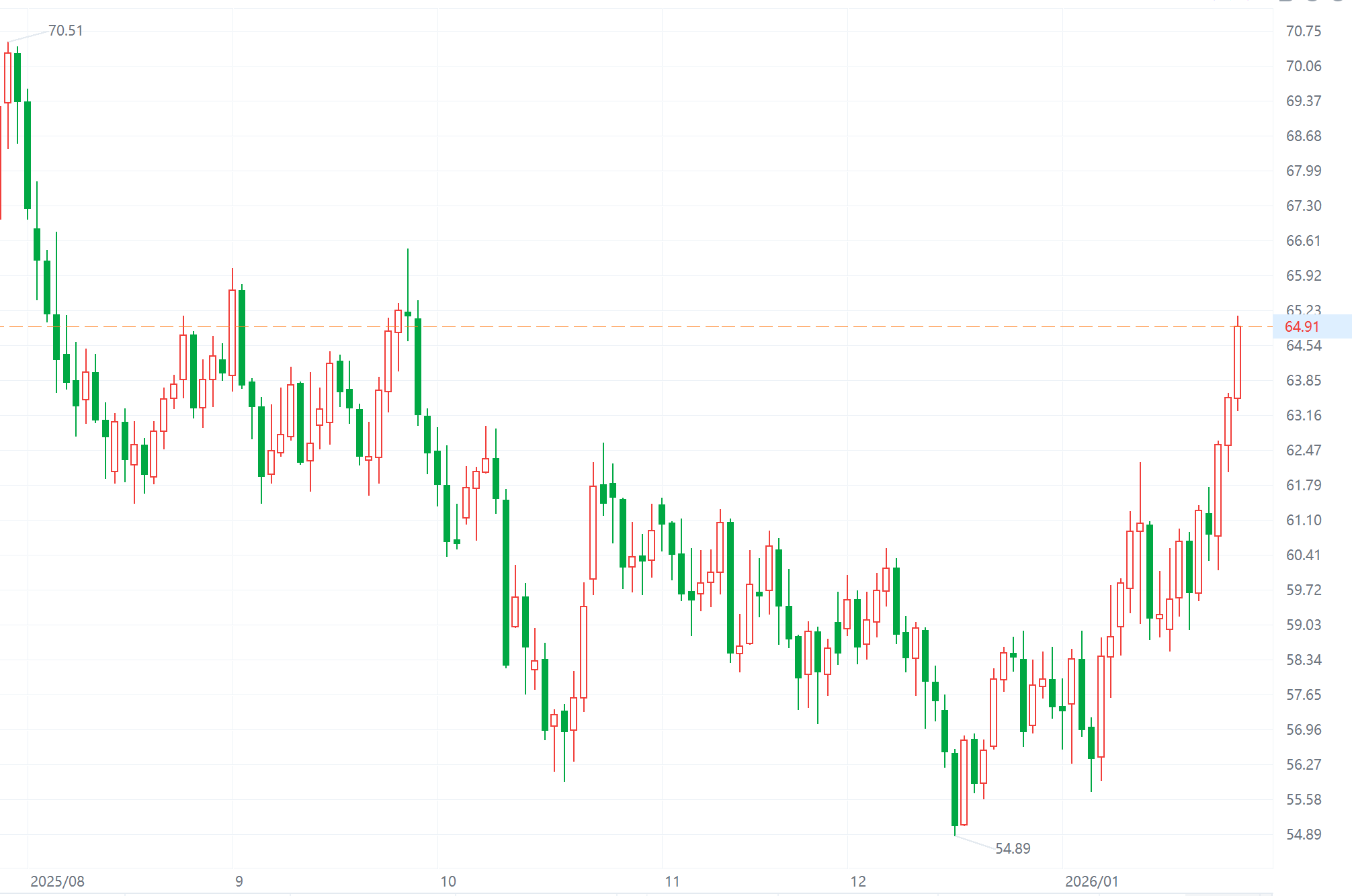 財(cái)聯(lián)社1月29日電,WTI原油期貨向上觸及65美元/桶,最新報(bào)65.002美元/桶,日內(nèi)上漲2.83%,創(chuàng)2025年9月以來新高。布倫特原油3月合約自9月以來首次升破每桶70美元。市場擔(dān)憂美國可能對(duì)伊朗發(fā)起攻擊。