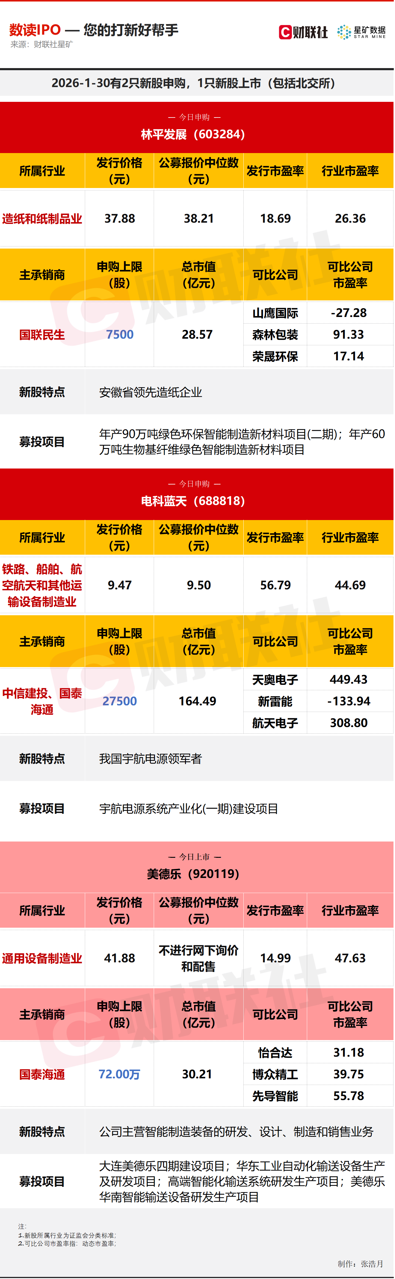 財聯(lián)社1月30日電,今日有2只新股申購,分別為滬市主板的林平發(fā)展,科創(chuàng)板的電科藍(lán)天;有1只新股上市,為北交所的美德樂。