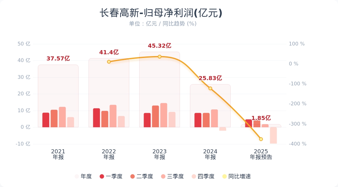 財(cái)聯(lián)社1月30日電,長春高新(000661.SZ)公告稱,公司預(yù)計(jì)2025年歸屬于上市公司股東的凈利潤為1.50億元-2.20億元,比上年同期下降91.48%-94.19%。報(bào)告期內(nèi),公司持續(xù)聚焦內(nèi)分泌代謝、女性健康等傳統(tǒng)優(yōu)勢業(yè)務(wù)領(lǐng)域與腫瘤、呼吸、免疫相關(guān)創(chuàng)新方向,穩(wěn)步推進(jìn)有差異化和全球市場潛力的產(chǎn)品研發(fā)相關(guān)工作,隨著公司相關(guān)研發(fā)工作的推進(jìn)及多款產(chǎn)品進(jìn)入臨床階段,使得相關(guān)研發(fā)費(fèi)用同比增加。報(bào)告期內(nèi),受行業(yè)競爭加劇等因素影響,公司控股子公司長春百克生物科技股份公司預(yù)計(jì)2025年度將出現(xiàn)虧損,導(dǎo)致公司相應(yīng)業(yè)績有所減少。小財(cái)注:長春高新2025年Q3凈利1.82億元,據(jù)此計(jì)算,2025年Q4凈利預(yù)計(jì)虧損9.45億-虧損10.15億。第四季度凈利潤分析師一致預(yù)測是10.67億,業(yè)績低于預(yù)期。