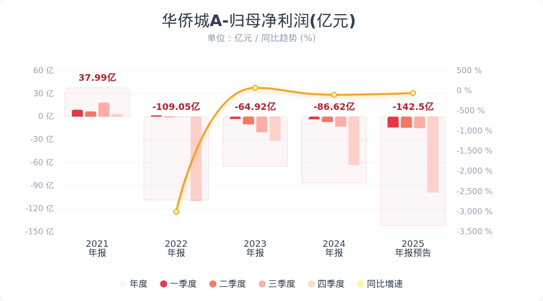 財(cái)聯(lián)社1月30日電,華僑城A(000069.SZ)發(fā)布2025年年度業(yè)績預(yù)告,預(yù)計(jì)2025年凈利潤虧損130億元—155億元,上年同期虧損86.62億元。公司根據(jù)市場情況動態(tài)調(diào)整經(jīng)營及銷售策略,地產(chǎn)業(yè)務(wù)收入結(jié)轉(zhuǎn)金額和毛利率下降;年初明確“強(qiáng)去化、促回款”為核心策略,通過資產(chǎn)轉(zhuǎn)讓等方式全力推動存量業(yè)務(wù)銷售去化與現(xiàn)金流改善,在第四季度取得了較大進(jìn)展,部分交易形成虧損。小財(cái)注:華僑城A 2025年Q3凈利-14.99億元,據(jù)此計(jì)算,2025年Q4凈利預(yù)計(jì)虧損86.33億元-虧損111.33億元。