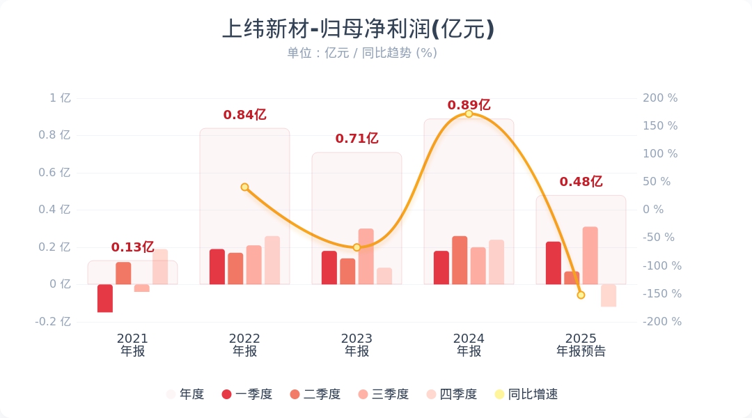 《科創(chuàng)板日?qǐng)?bào)》30日訊,上緯新材(688585.SH)公告稱,預(yù)計(jì)2025年年度實(shí)現(xiàn)歸屬于母公司所有者的凈利潤(rùn)與上年同期(法定披露數(shù)據(jù))相比,將減少3300萬元到4800萬元,同比減少37%到54%。上年同期歸屬于母公司所有者的凈利潤(rùn)為8,868.14萬元。凈利潤(rùn)較上年同期減少主要系新材料業(yè)務(wù)加大研發(fā)投入、計(jì)提投資損失和信用減值損失、探索新方向增加費(fèi)用投入等。小財(cái)注:Q3凈利潤(rùn)3065萬元,據(jù)此計(jì)算,Q4預(yù)計(jì)凈虧損486.6萬元-1987萬元。第四季度凈利潤(rùn)分析師一致預(yù)測(cè)為3600萬元。