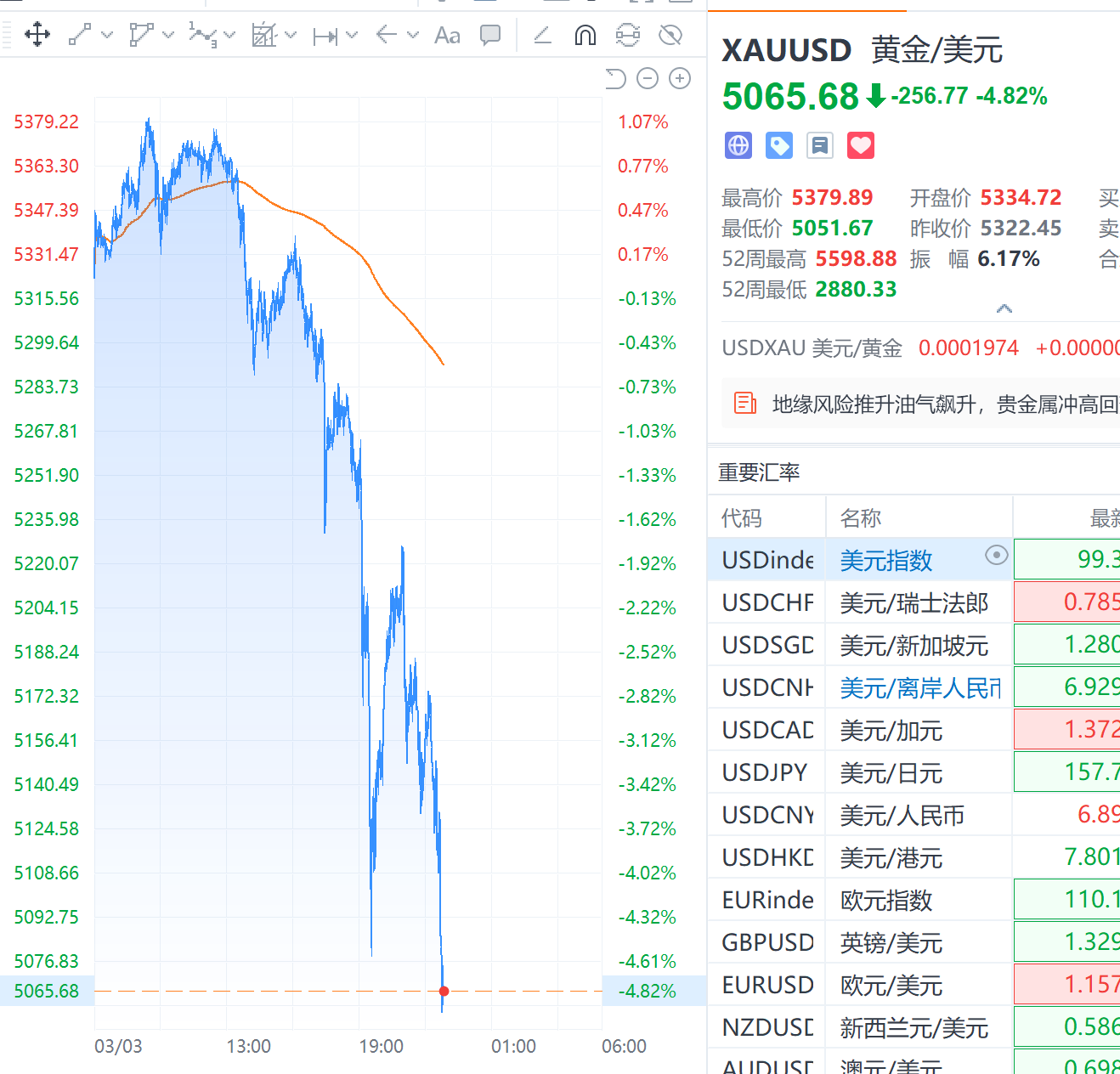 財(cái)聯(lián)社3月3日電,現(xiàn)貨金價(jià)延續(xù)跌勢,最新下跌5%,至每盎司5,060美元。